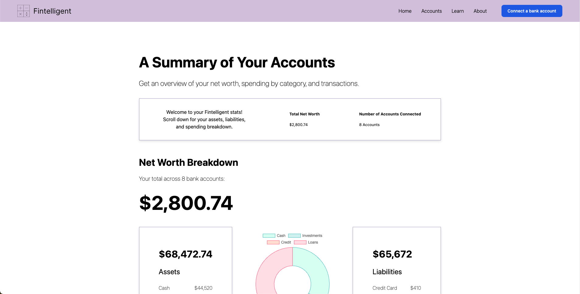 Financial service integrated with Plaid API to help users track spending and promote financial education. Offers breakdown of net worth by assets and liabilities and by specific accounts like cash, investments, credit, and loans. React.js was used for the front end of the website and Express.js as the back end. Used Plaid Link API feature to get an access token for the Plaid sandbox.