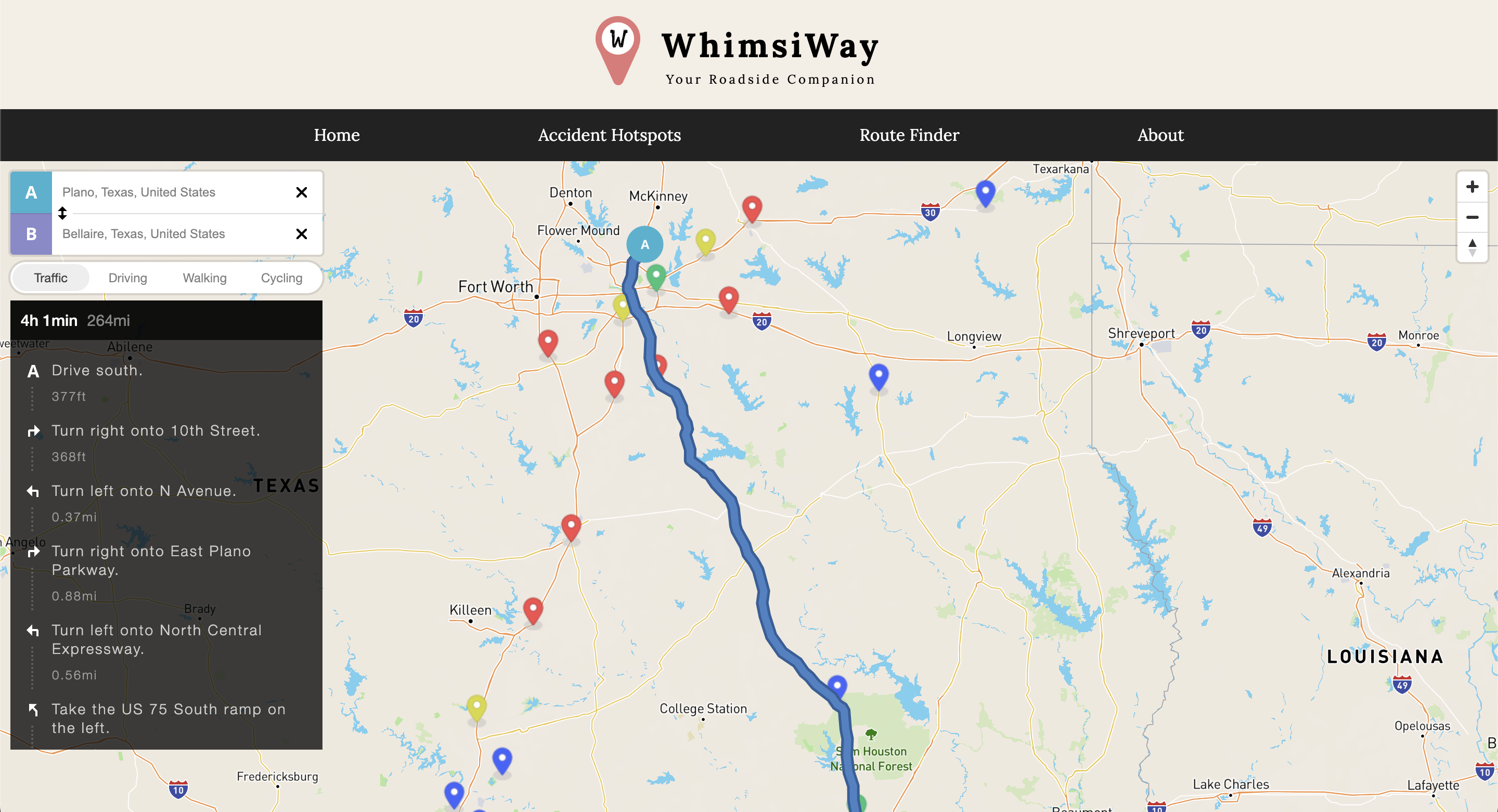 Offers insights into past car accidents in Texas, enabling users to identify the top 5 most accident-prone areas in a city. Also includes a route planner with accurate Mapbox GL interactivate map to help users avoid accident hotspots. Incorporated DBSCAN clustering algorithm to find accident hotspots from Texas accidents Kaggle dataset.